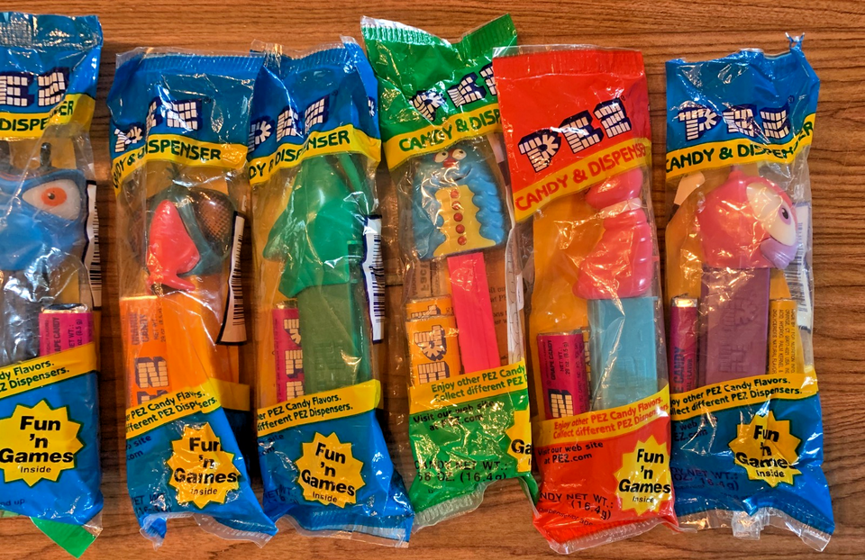 Note: PEZ candies may have exceeded shelf life, sold as collectibles. Character names are approximate.