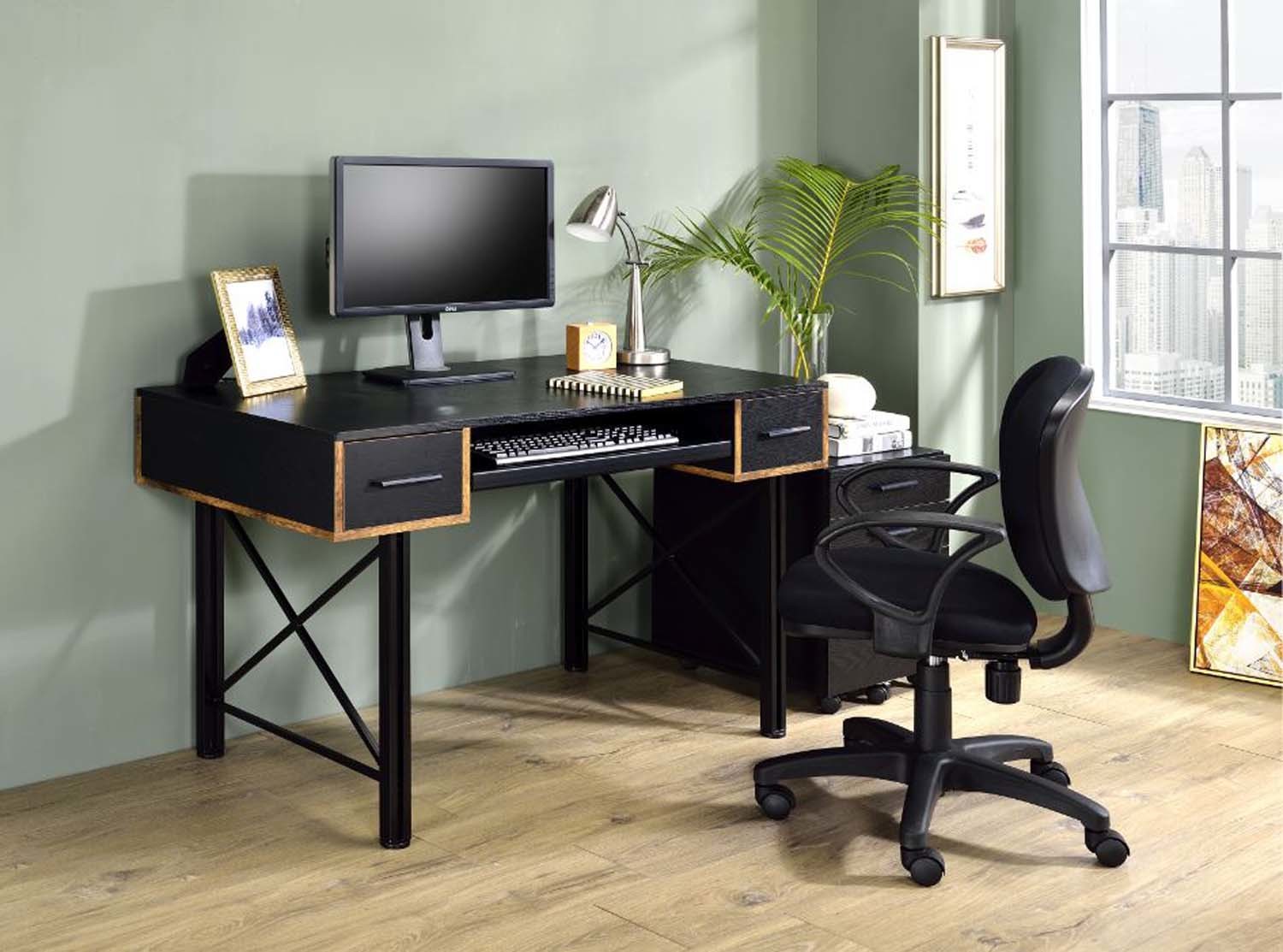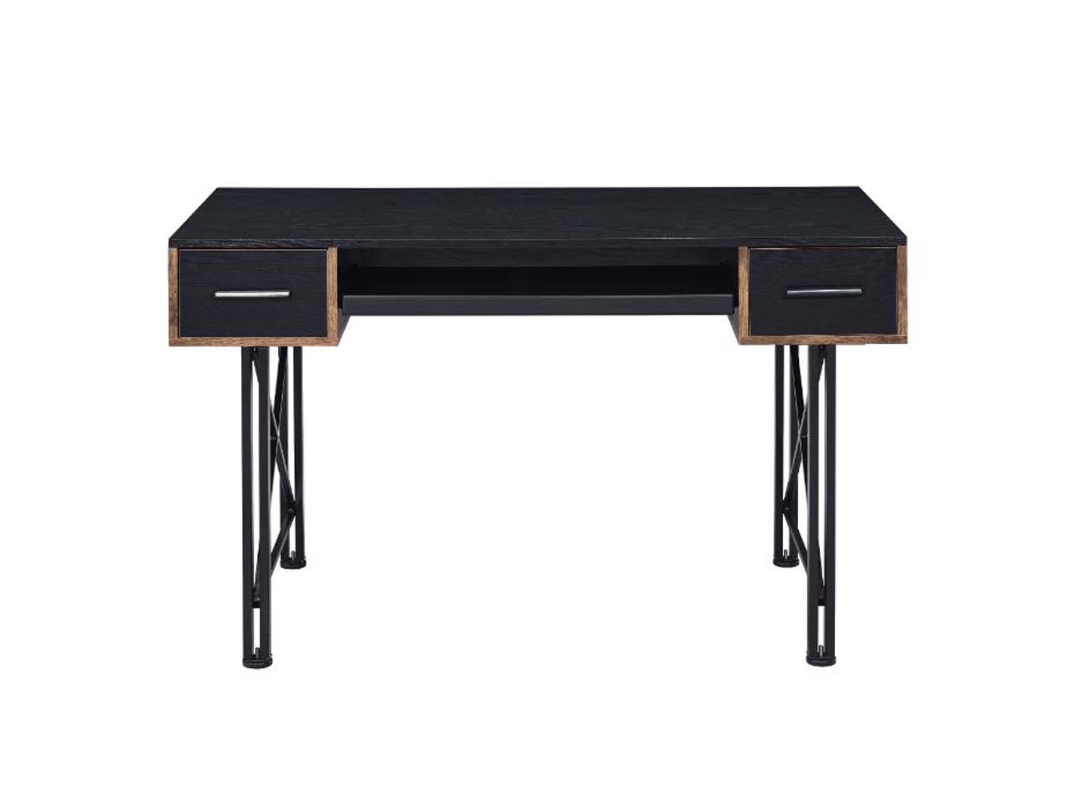 The Settea Desk bring a mix-and-match look with distressed casegood and black metal frame. Found atop a double pedestal base, It is accented with metal trim and "X" shaped support for industrial details. The rectangular table is designed for a spacious top, while rustic finish will warm your workplace with natural earth tone. Two drawers on both sides help you clean the table top, and a keyboard tray under the top is perfect for a PC user.