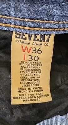 Please see all photos. The Seven7 Jeans Mens 36x30 (Actual 36x28) in Blue are a stylish and versatile addition to any man's wardrobe. These straight-cut, mid-rise jeans feature a dark denim fabric with a stretch for added comfort and flexibility. The classic 5-pocket design and branded accents make them a timeless choice for everyday wear. With a regular fit and classic style, these jeans are perfect for all seasons and can be easily cared for with machine washing. Made with a cotton blend material, these jeans offer both durability and a great look.