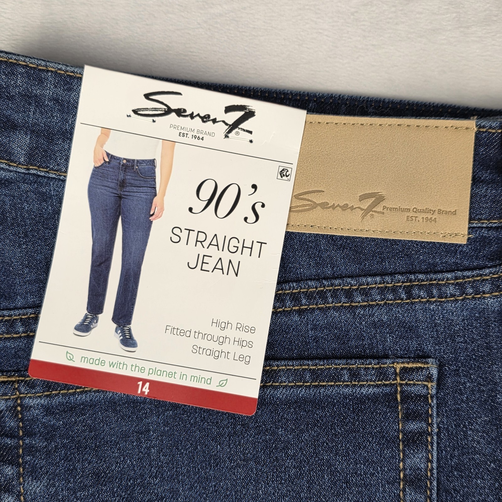 These Seven7 Jeans in a size 14 are a stylish nod to the 90's with a divine blue denim color. Made from a blend of polyester, spandex, and cotton, these straight-cut jeans feature a high-rise waist and a 5-pocket design for added convenience. The medium wash and solid pattern give them a timeless look, while the zip and button closure and regular fit make them comfortable and easy to wear. With a trendy logo accent, these jeans are a versatile addition to any wardrobe for all seasons.