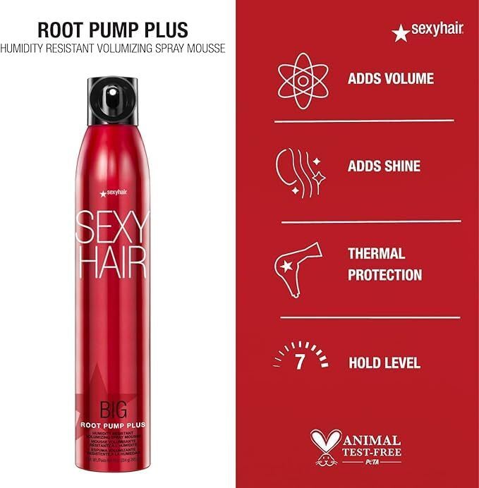 Zoom in on big volume. SexyHair Root Pump Plus Humidity Resistant Volumizing Spray Mousse has a targeted application designed for medium to coarse hair to provide long-lasting volume and fullness with a medium hold. This all-over bodifying mousse provides humidity resistance and style memory up to 48 hours.