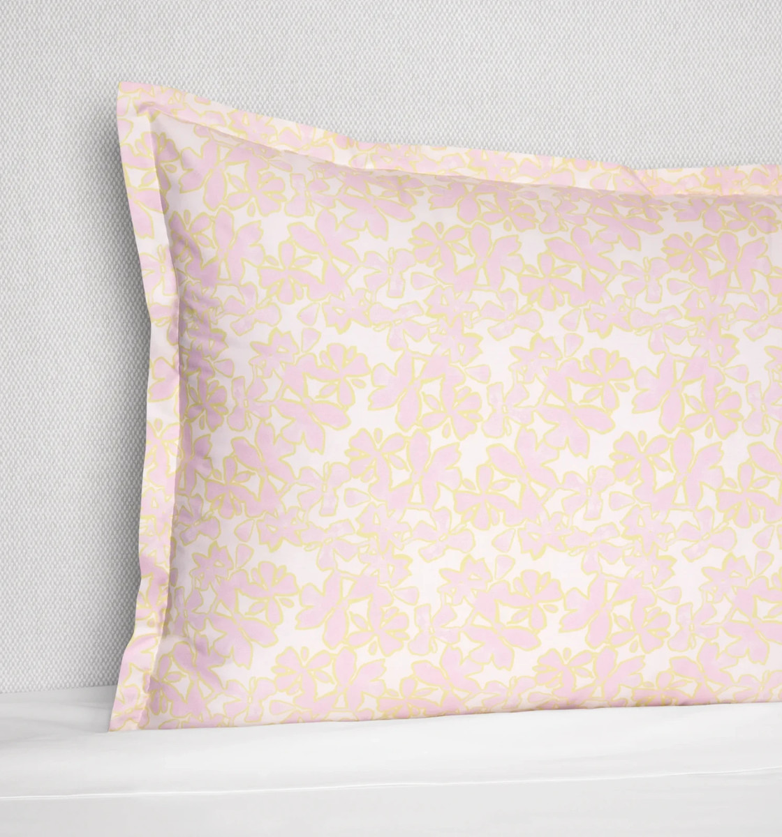Petal-pink and lemon-yellow flowers bloom into an irresistible all-over pattern in Prato, a springtime-inspired collection. The coordinating Fiorina collection features a double border of yellow and pink satin-stitch overlaid by yellow and pink blossoms. Together, Prato and Florina create a bed as bright as it is enchanting, sparking many a sweet dream to come.