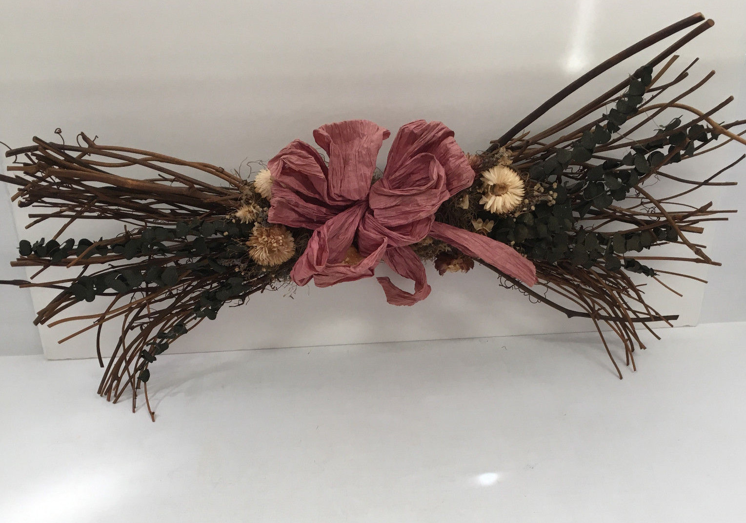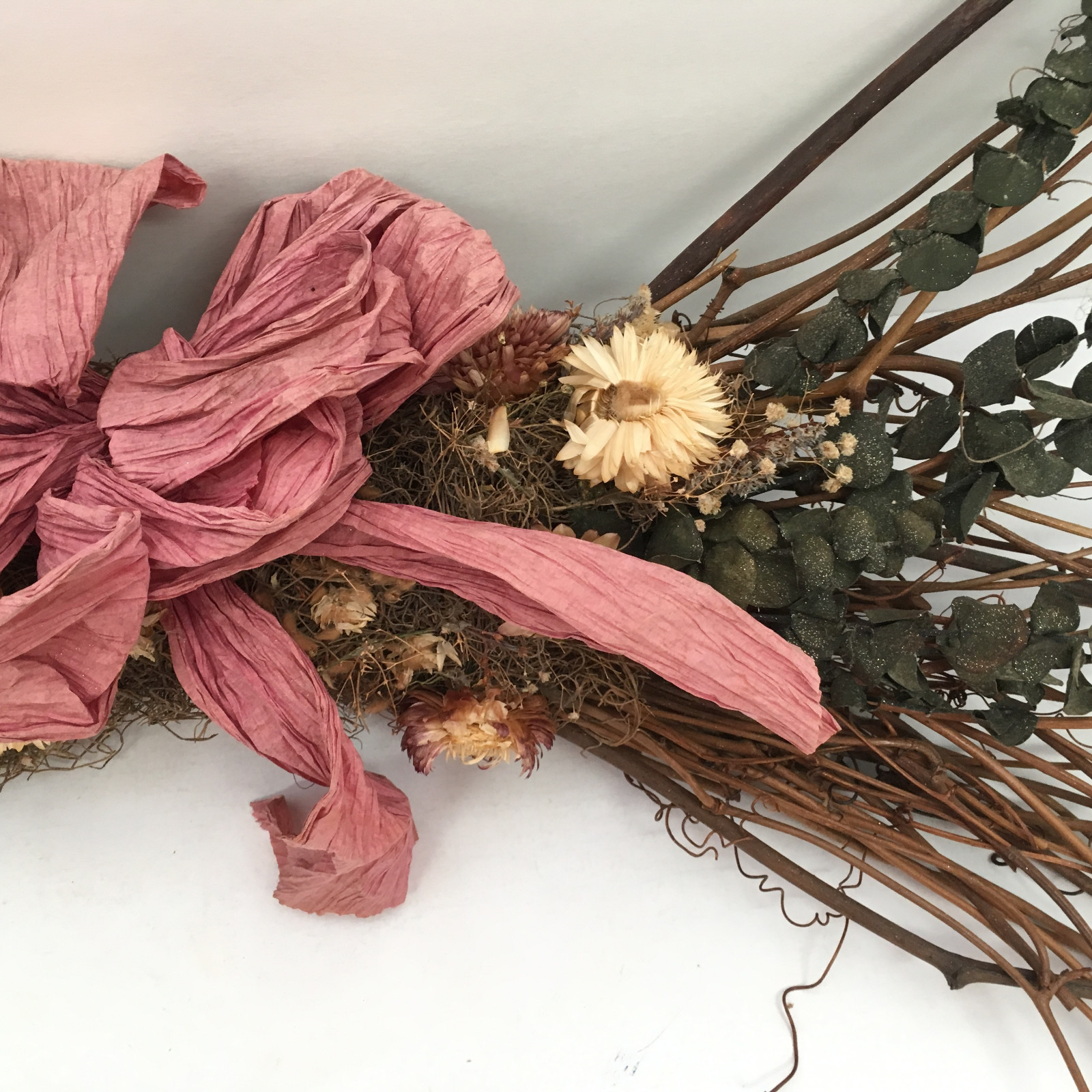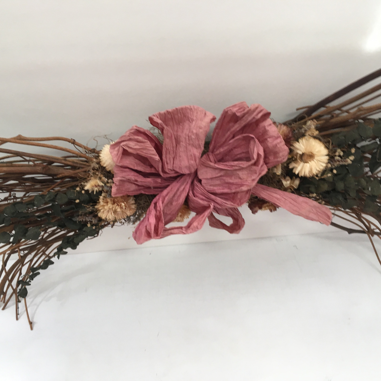 twigs and branches with dry flowers pink paper bow
