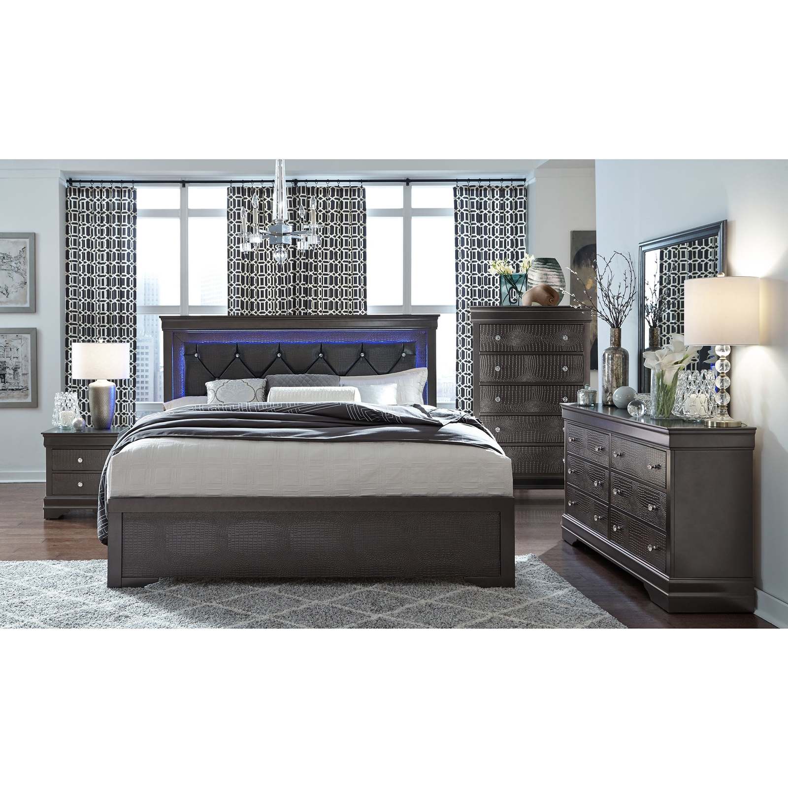 Place of Origin Malaysia Main Color Grey Main Material Solid Wood+MDF Product Style Contemporary Bed Size Queen Box Spring Requirements Box Spring Required Wood Type Rubberwood Use Case Bedroom Wood Tone Gray Bed Frame Material Wood Pieces Included Bed Included,Chest Included,Dresser Included,Mirror Included,Nightstand Included Number of Pieces 5 Piece Set Bed features Built-in Lighting Upholstery Material Faux Leather Dangerous Goods #dangerFlag#