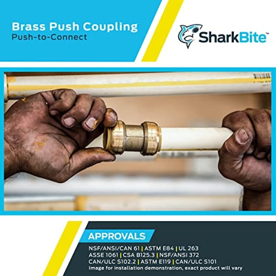 Easily connect pipe in seconds with the SharkBite Push-To-Connect 1 1/2 inch Straight Coupling. This plumbing fitting joins copper, PEX, CPVC, HDPE, or PE-RT pipe in any combination. With no soldering, clamps, or glue required, connections are as simple as inserting a pipe into the fitting deep enough to be sealed by the specially designed O-ring. Once inserted, the fitting's stainless-steel teeth bite down and grip the pipe. Disassembly is just as easy with the simple SharkBite disconnect tool. The SharkBite Straight Coupling is designed for potable water and radiant heating applications (including underground or behind-the-wall applications) with no access panels required. SharkBite products work with your existing plumbing, are easy to disassemble for changing and reusing fittings, and can be rotated for easier installation in tight spaces. SharkBite fittings are lead-free and meet all requirements for plumbing in California and Vermont. SharkBite is a provider of plumbing and water control systems for domestic, commercial, and industrial applications. Trusted by plumbing professionals, SharkBite manufactures a wide range of plumbing fittings, water control valves, and PEX pipe, making it the only total plumbing solution from meter to fixture.