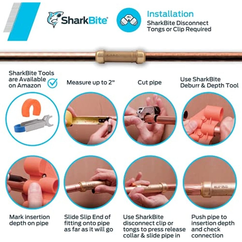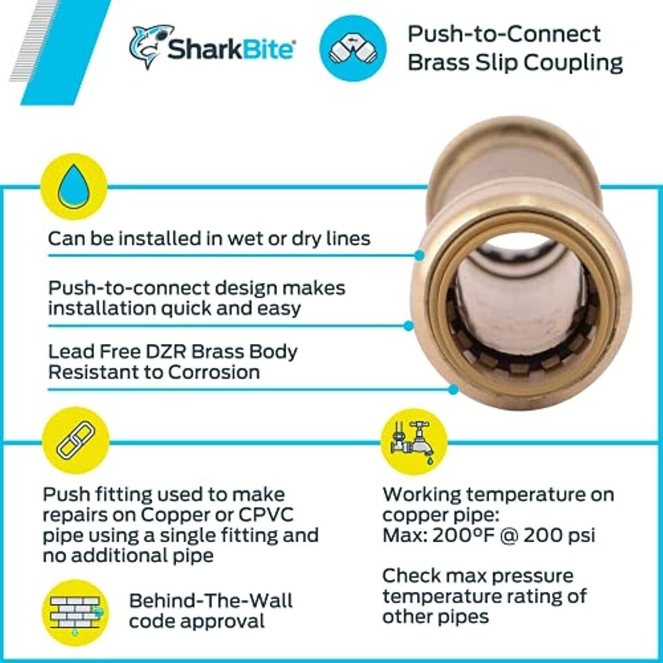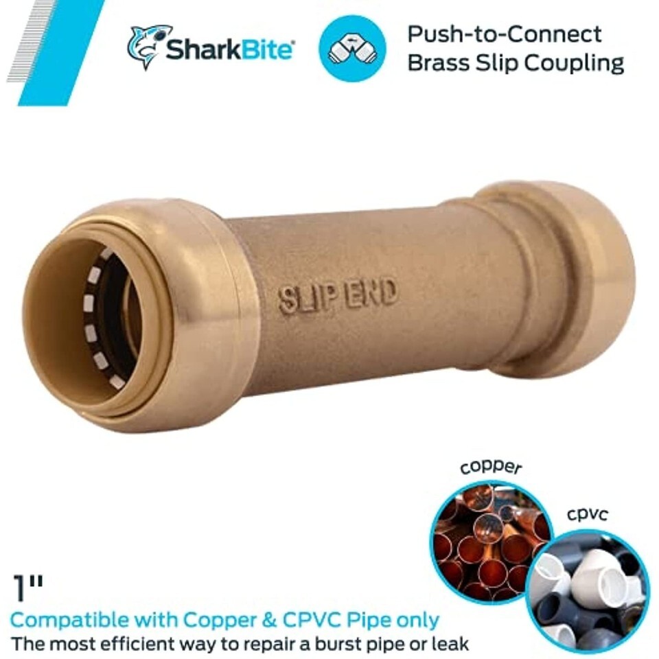 Product Description CUT. PUSH. DONE. Ideal for making quick repairs on copper and CPVC pipe. Remove and repair up to two inches of damaged pipe using a single fitting, no additional pipe required. The SharkBite Connection System makes any plumbing project fast and easy thanks to unique push-to-connect technology. When you insert a pipe into a SharkBite quick-connect fitting, the fitting's stainless-steel teeth bite down and grip the pipe, while its special O-ring compresses to create a watertight seal. No soldering, no clamps, no glue. SharkBite products work with your existing plumbing, are easy to disassemble for changing and reusing fittings, and can be rotated for installation in tight spaces. Whether you need to repair a broken pipe or plumb a whole house, SharkBite provides a push-to-connect solution and leak-free results. From the Manufacturer SharkBite U3020LFA Slip Coupling 1-Inch X 1-Inch Lead Free