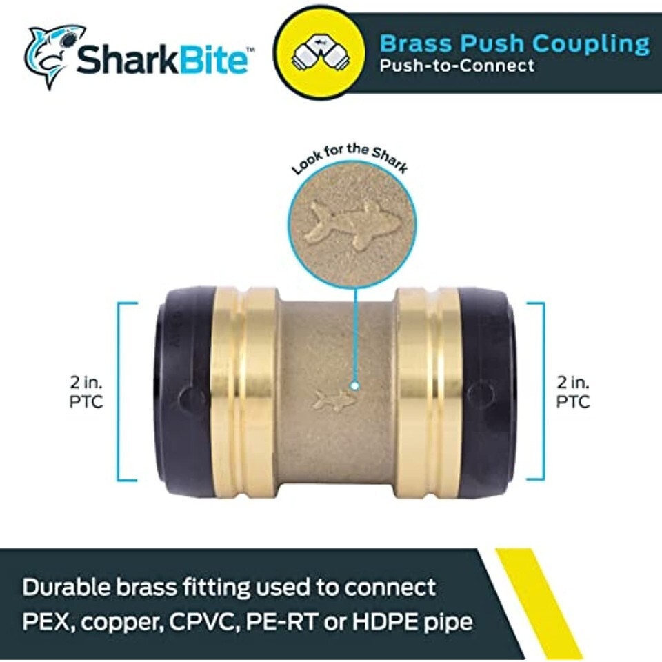 CUT. PUSH. DONE. The SharkBite 2 inch Straight Coupling is intended to make connections in tight areas. The SharkBite Connection System makes any plumbing project fast and easy thanks to unique push-to-connect technology. When you insert a pipe into a SharkBite quick-connect fitting, the fitting's stainless-steel teeth bite down and grip the pipe, while its special O-ring compresses to create a watertight seal. No soldering, no clamps, no glue. SharkBite products work with your existing plumbing, are easy to disassemble for changing and reusing fittings, and can be rotated for installation in tight spaces. Whether you need to repair a broken pipe or plumb a whole house, SharkBite provides a push-to-connect solution and leak-free results.