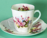 Shelley Stocks pattern demitasse cup and saucer in Dainty shape, hand written #19429 (or it might be #10429), Rd 272101. Pink rim. Mint condition.