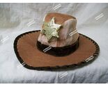 Oversized Kids Sheriff Costume Hat. Old West / Western Cowboy Themed. Unisex: Male or Female. Tag says not suitable for children under 3 due to small parts. May fit teens and small adult. Collapsible Cowboy hat is tan with a brown band. Plastic Gold sheriff badge on the front of hat. Will require some shaping. This item ships collapsed in an envelope.