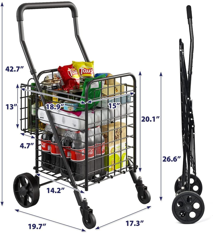 Durably Built: There¡s nothing worse than investing in a poorly made product. We are committed to engineering a grocery cart that can sustain long-term, frequent use. Using premium metal materials, this grocery cart with wheels has been carefully crafted to withstand even the toughest wear and tear