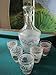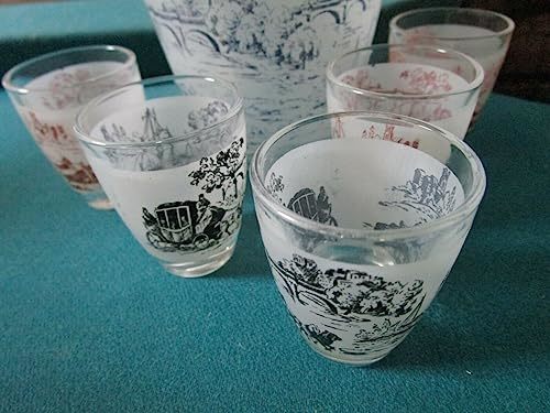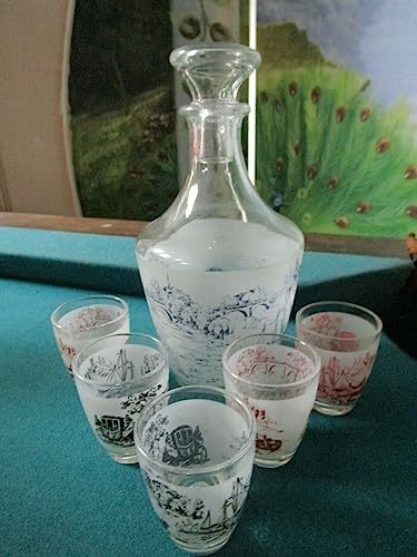 SHOT GLASSES MID CENTURY GOLD MADE IN FRANCE PICK 11- DECANTER AND 5 SHOT GLASSES, TRANSFERWARE SHIPS ON BODY DECOR, DECANTER IS 7", CUPS 2"