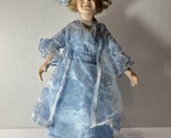 This 17" Show Stoppers porcelain doll depicts the Queen Mother in regal mid-century attire, complete with a matching wide-brimmed hat and stand. A charming homage to British royal history, this collectible features delicate hand-painted facial details and layered blue lace garments. Ideal for collectors of royal family memorabilia or vintage porcelain dolls.