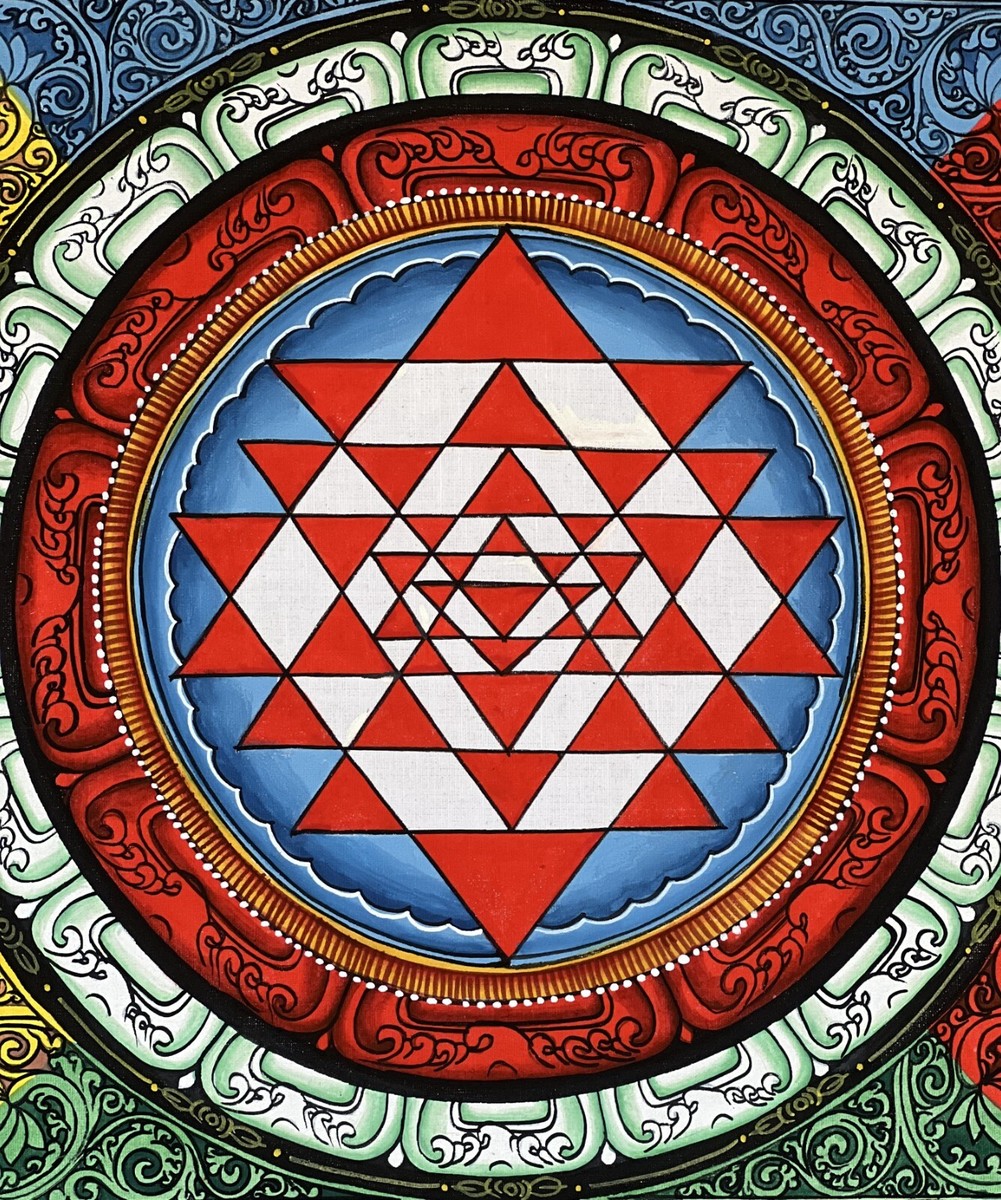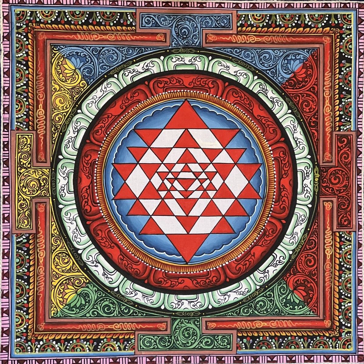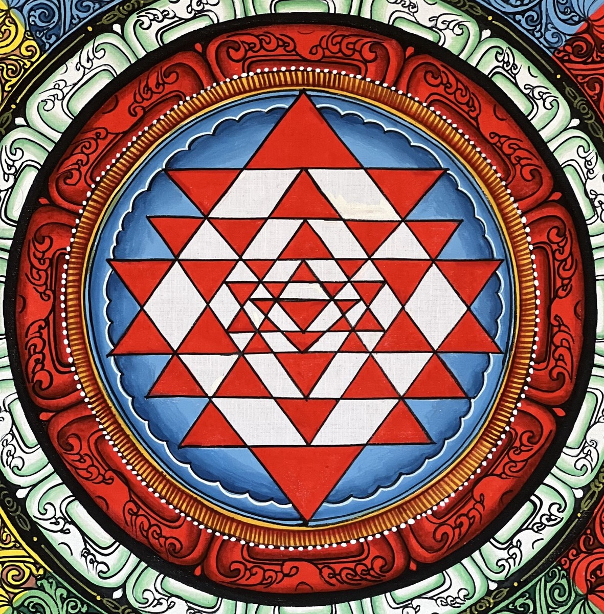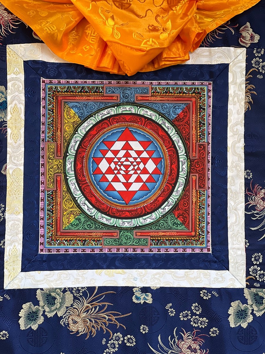 - SHRI YANTRA/ SHRI CHAKRA MANDALA NEWARI PAUBHA THANGKA PAINTING WITH SILK BORDER