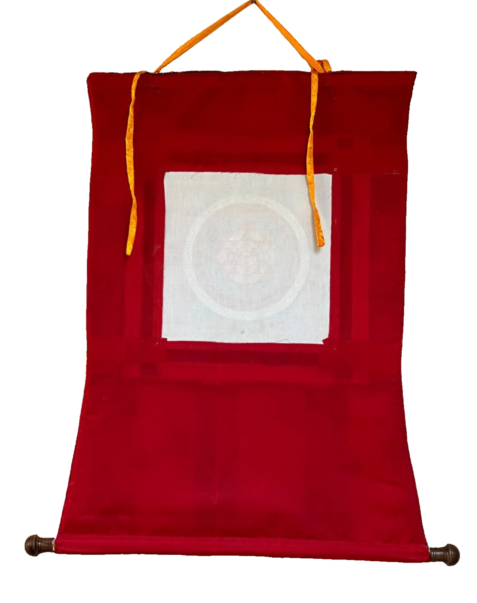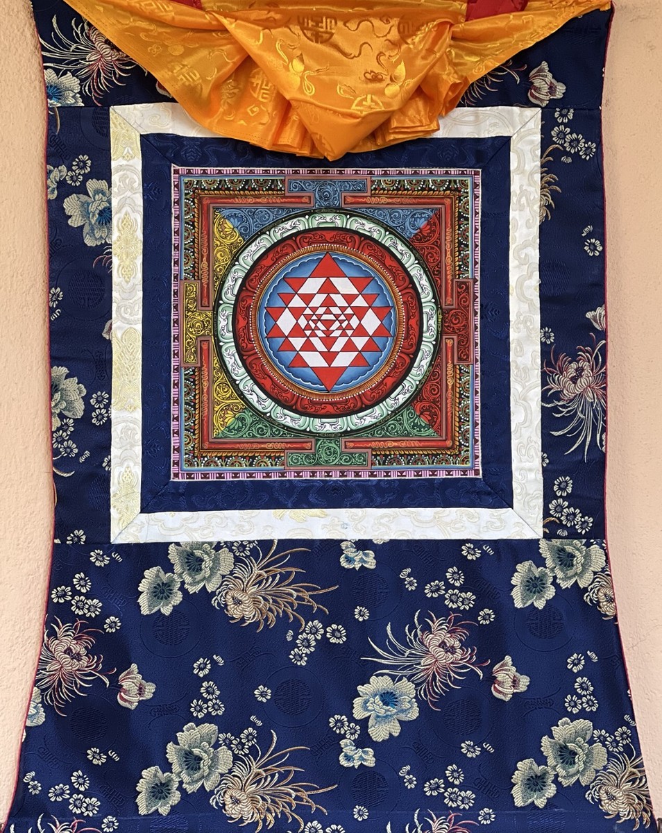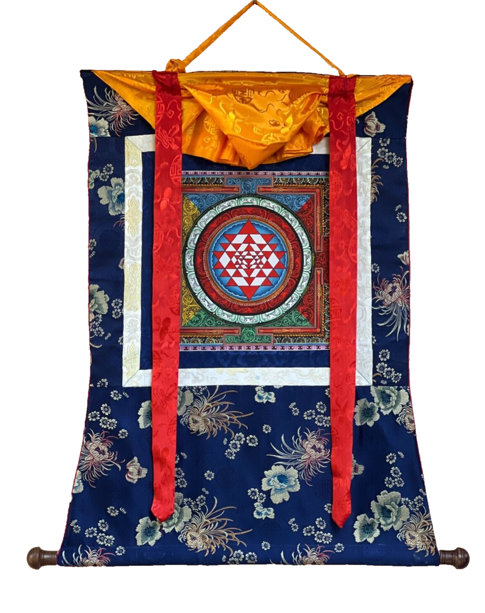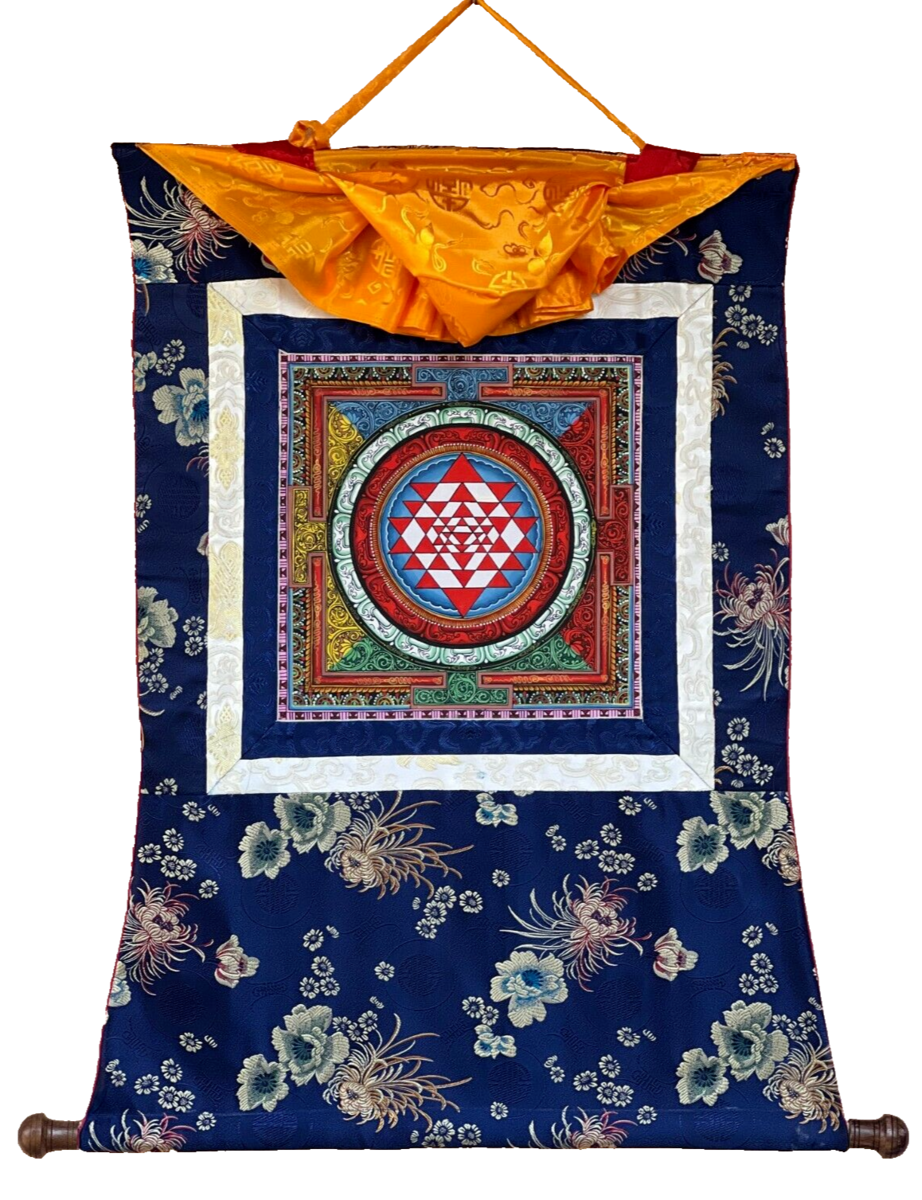 - SHRI YANTRA/ SHRI CHAKRA MANDALA NEWARI PAUBHA THANGKA PAINTING WITH SILK BORDER