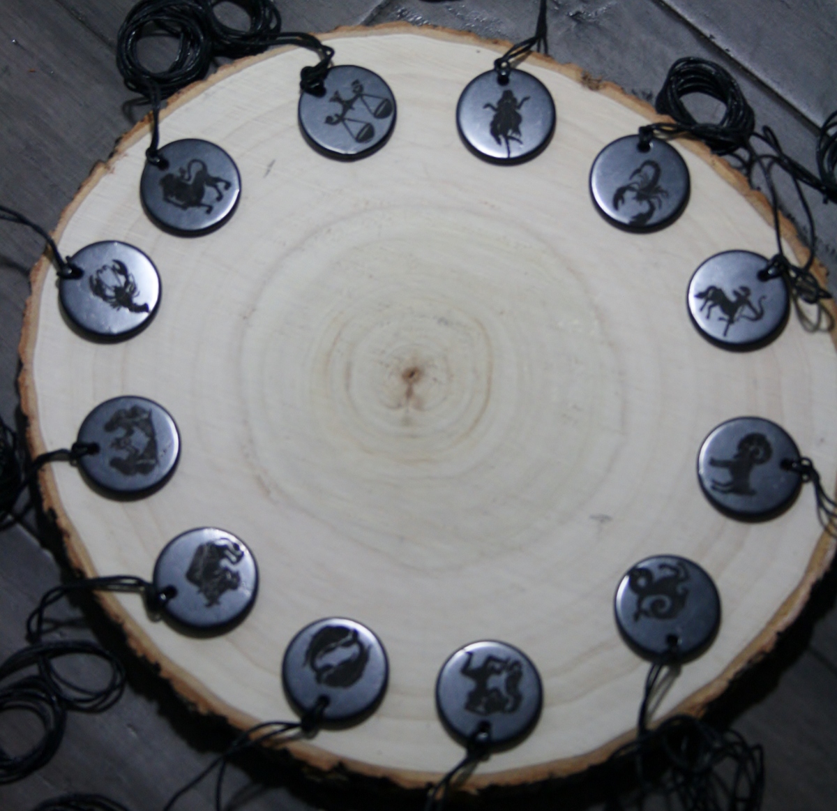 You are choosing one (1) Shungite Pendant from Russia. The pendant comes ready to wear with a black cord. There are 12 engraved zodiac signs to choose from. One of the 12 signs of the zodiac is engraved on each pendant. These are natural stones so each one is unique. All zodiac signs are engraved on 3cm round Shungite stone pendant disks, as pictured.