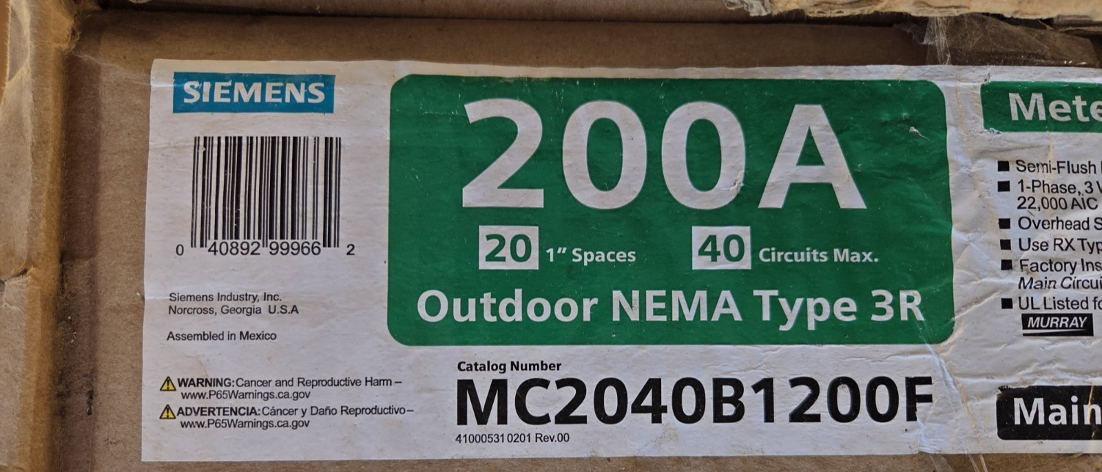 - Siemens MC2040B1200F 20 Space 40 Circuit 200-Amp Flush Mount Meter Load Center