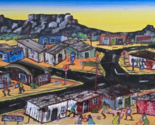 This product is a signed 2010 N. King mixed media painting of a South African township scene, created with 3D tin advertisement plates. The artwork showcases a blend of Afrofuturism, Urban Art, and Black Folk Art styles, with influences from Art Deco and African Recycled Tins Street Art. Measuring 24 inches in length and 10 inches in height, the unframed piece is a unique one-of-a-kind original creation, featuring elements of metal, acrylic, and other materials. The painting captures the essence of South African culture and architecture, making it a special addition to any art collection.