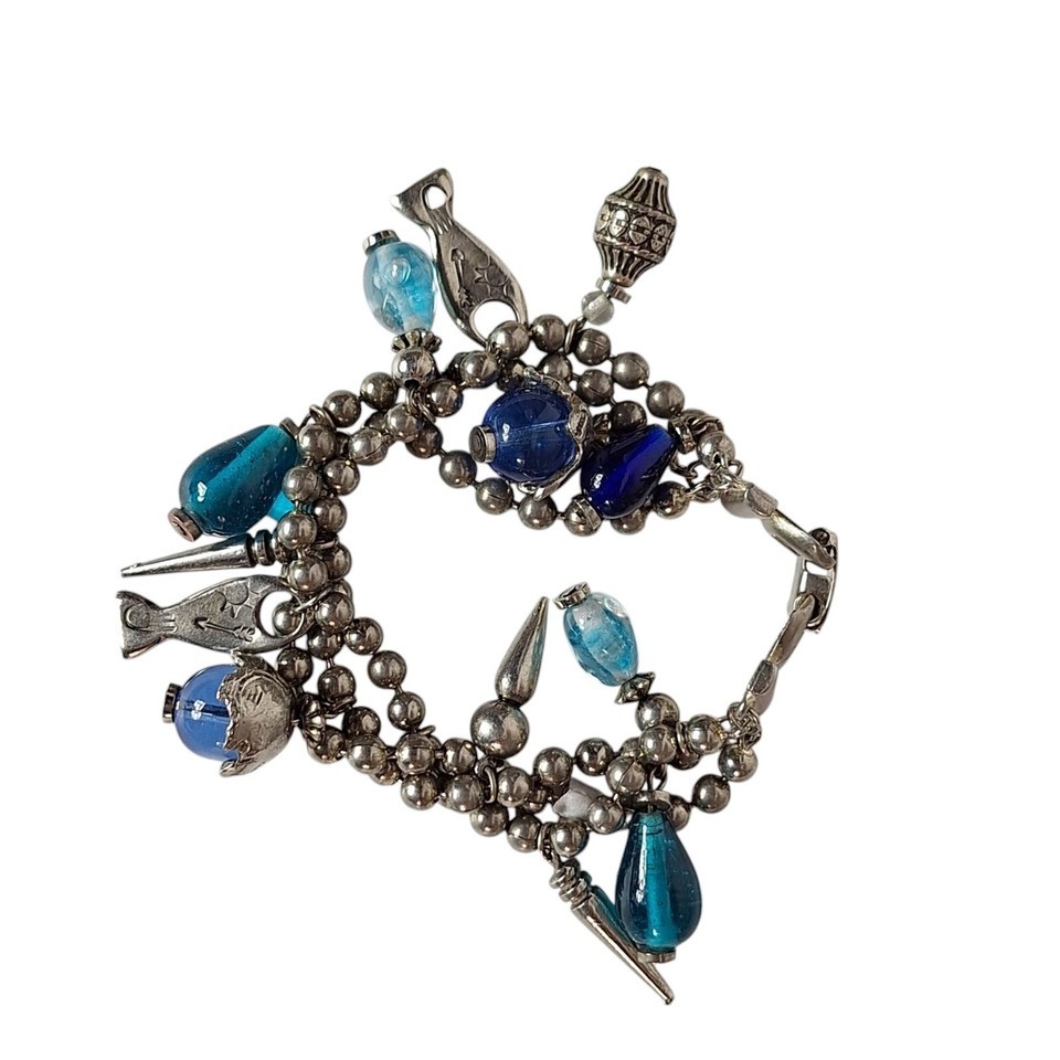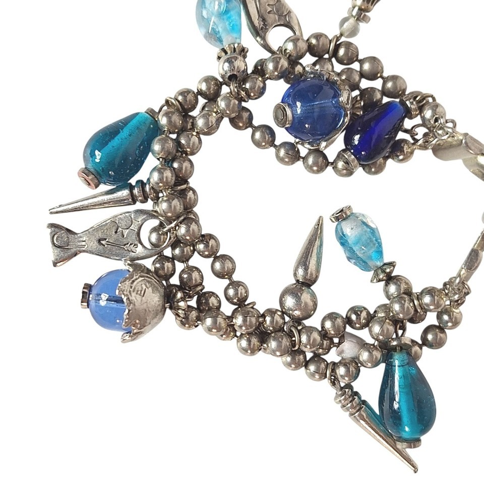 This bracelet features a combination of silver-toned beads and blue glass elements, accented by unique fish and pointed metal pendants. Crafted to enhance any attire, its eclectic design showcases intricate detailing and quality materials, making it a valuable addition to any jewelry collection.