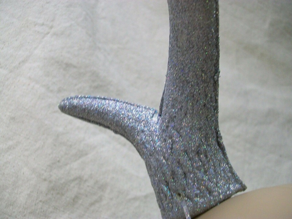 Glittery Deer Antlers Costume Horns. Light Weight foam like horns cover with a silver prismatic glitter. The glitter sheds a lot. Has an elastic string with a toggle to adjust. Please note that the horns will fit as shown on mannequin. I have them turn the wrong direction in the other photos. you could try to re-string them if you want to wear them like this. Not intended for children under 14 years of age.