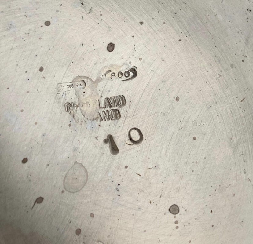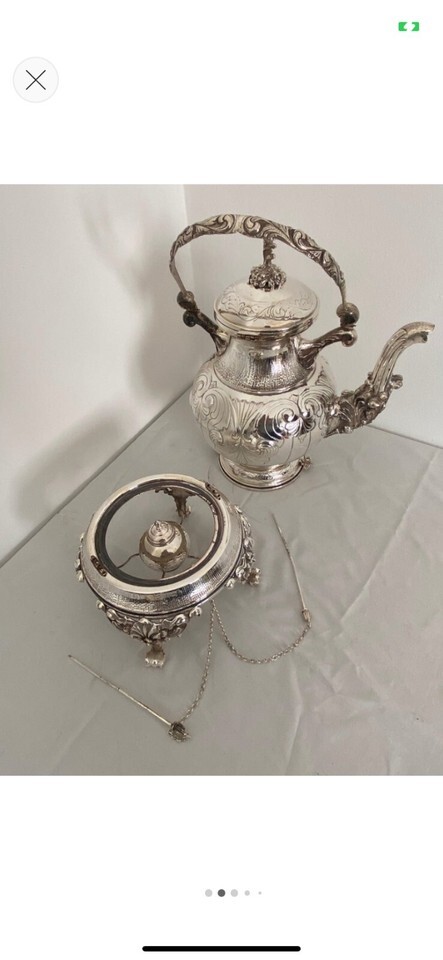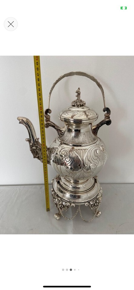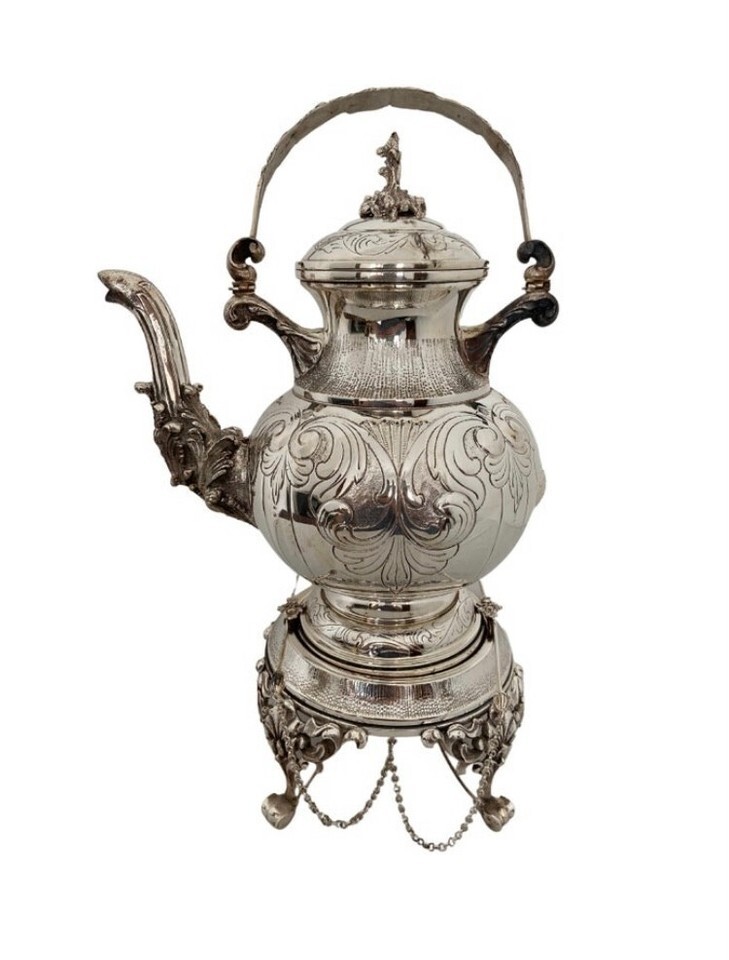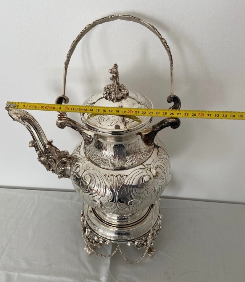 Samovar Silver 800, con fornello, funzionante. Prodotto da un argentiere italiano negli anni 90 e in ottime condizioni ha una saldatura in un manico che ha solo bisogno di essere lucidato. Si compone di tre pezzi: il bollitore, la base e il fornello. Il peso totale e di 3256 grammi. 47 cm di altezza, 27 cm di larghezza.Regolarmente punzonato con segni di stato.