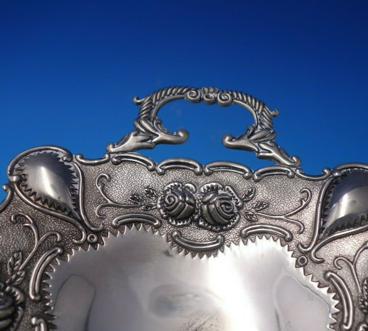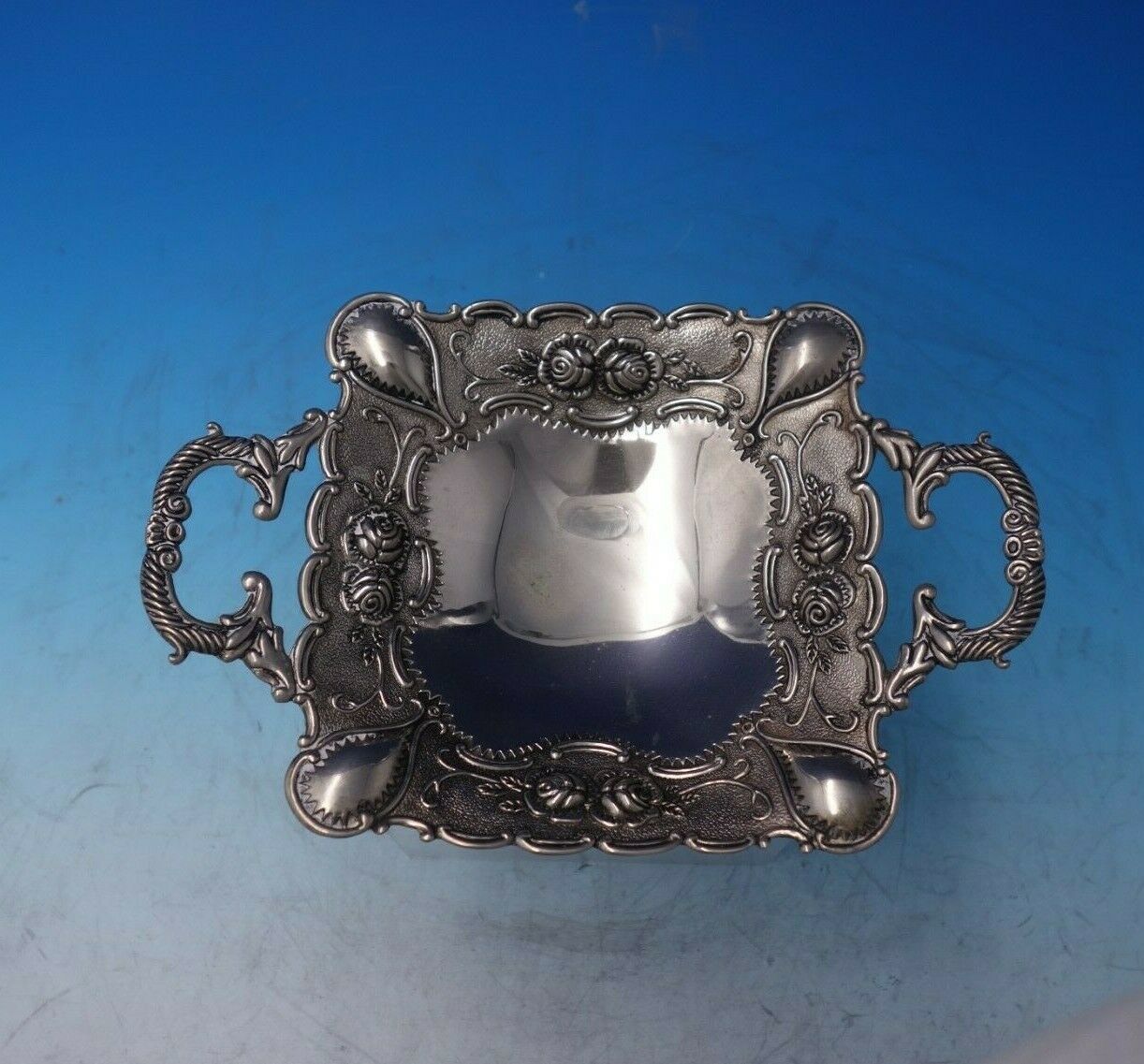 Lovely silver on copper square candy dish with handles and fancy roses (maker unknown). This piece measures 5 3/4" (8 1/2" with the handles). It is not monogrammed and is in good vintage condition as shown in the photos. Pretty!