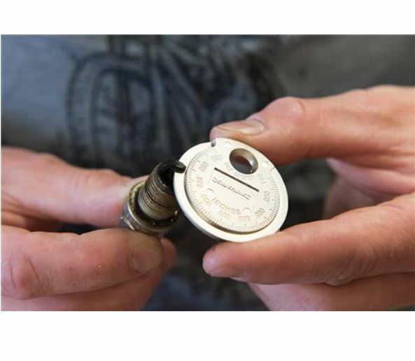 Coin-type tool with flanged hole to adjust the side wire without damaging the centre element and outer rim to measure the electrode gap.