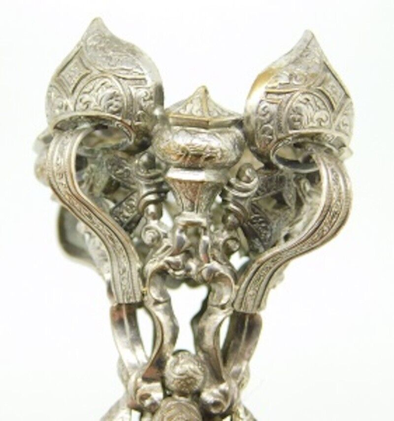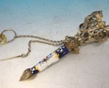 Wonderful silverplated bronze tussie mussie with porcelain handle. The porcelain has hand painted flowers and silver and gold paste paint. The elaborate four section cup has Moorish/Arabic styling. It measures 5 1/4" long and a 1 1/2" diameter interior of the cup. It has the pin and ring. Very good condition. The enamel has some minor crazing. There are two chips in the top coating of cobalt blue enamel just below the cup. Some silver plate loss. Beautiful piece!