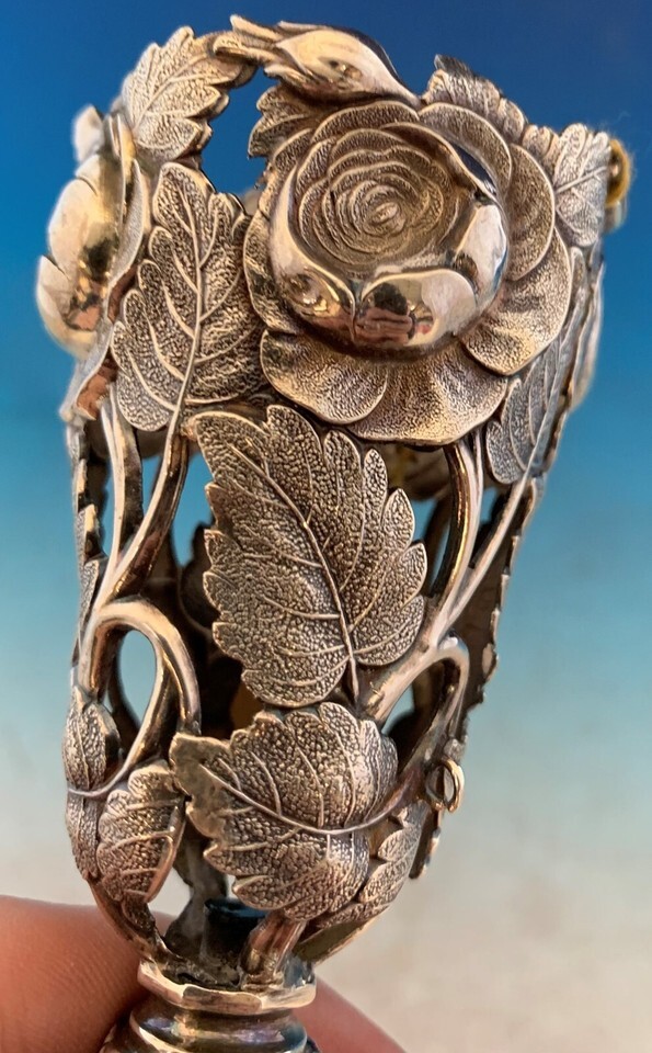 Beautiful large silverplated tussie mussie with four large roses. It measures 6" long. This is a tripod which has two legs, missing one leg. Engraved scrollwork on the handle/legs. It dates from the 1890s. Gorgeous!