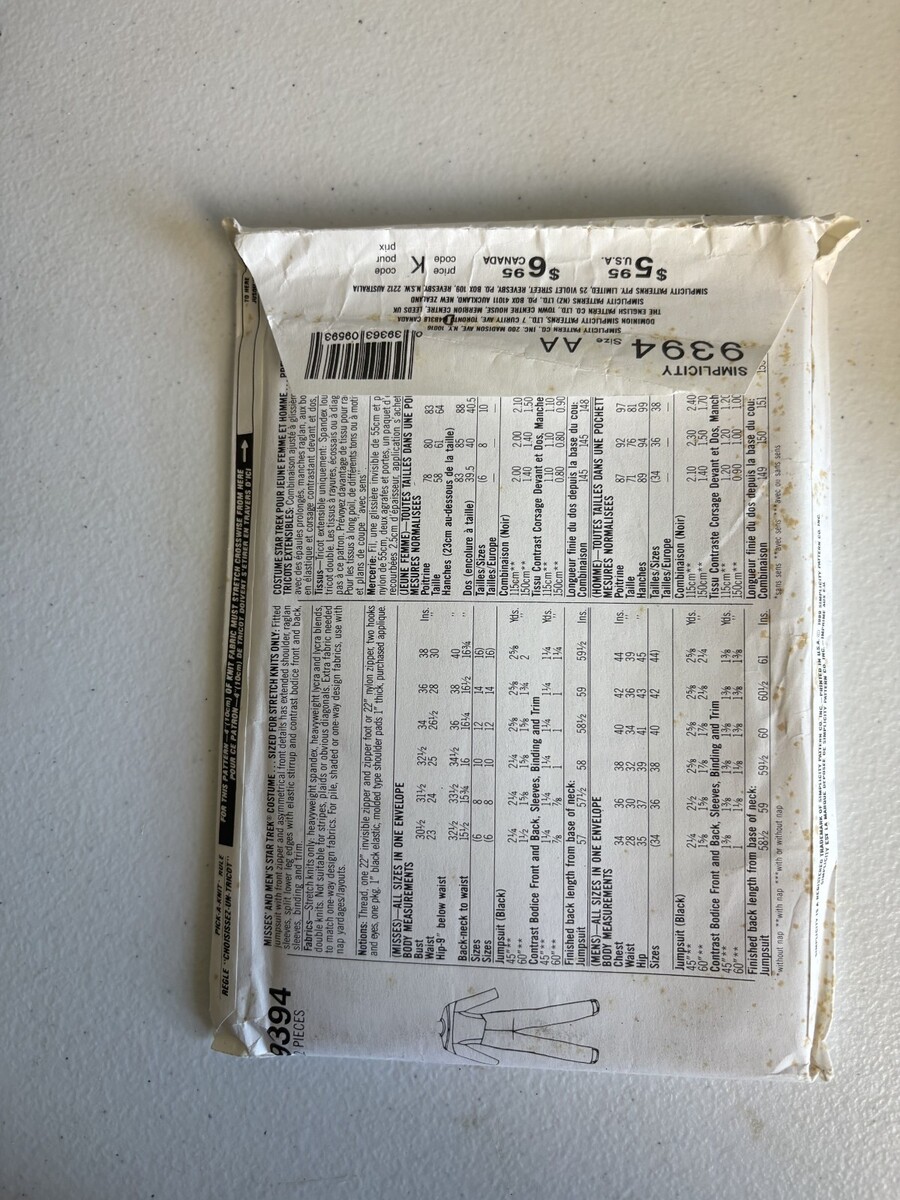 Simplicity Costume Pattern 9394 Size AA 6-16 Star Trek Uniform - Halloween, Theater, Cosplay - Uncut - Vintage 1989. This is a new, uncut pattern - UPC #03936309593. There is some foxing on the envelope - See Photos for further description.