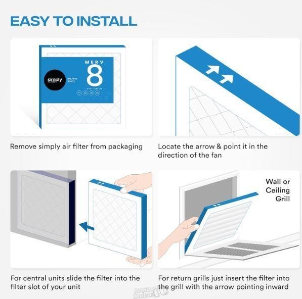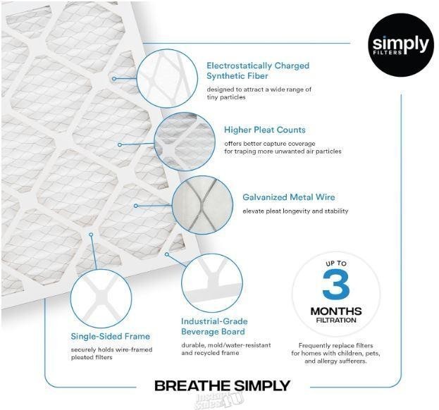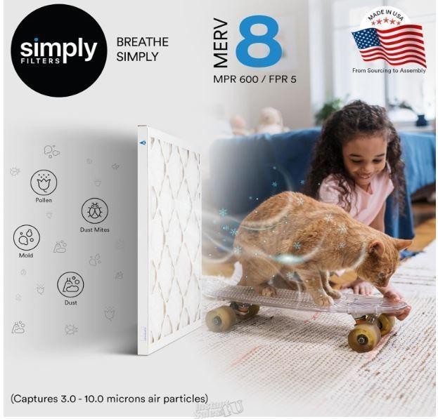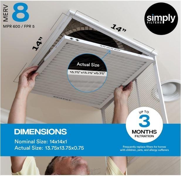 Universally Compatible: Measuring 14" x 14" x 1", with an actual size of 13.75"x13.75" x 0.75", Simply Filters works with almost any brand. Comparable to 3M Filtrete MPR 600, Filterbuy AFB Silver, and Honey well FPR 5. Cleaner Air Everywhere: Our filters capture dust, mold, pet dander, and pollen in homes, offices, schools, hospitals, and commercial spaces, trapping 90% of airborne particles, promoting a healthier living environment with clean and fresh indoor air. Advanced Pleated Technology: With a higher pleat count than most retail, our meticulously crafted filters offer superior capture coverage, optimizing airflow and efficiency. Long-lasting Filtration Easy Installation: Enjoy up to 3 months of resilient filtration. Hassle-free replacement for air conditioning units or HVAC systems. Follow airflow arrows and insert into the filter slot for central units or return grilles. Made in USA: Our filters are made using 100% American components, including recycled materials, ensuring superior performance and quality. Experience exceptional filtration and support local manufacturing.