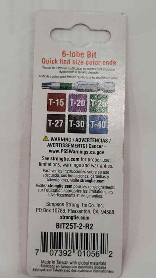 Simpson Strong-Tie Bit 25T-2-R2 T25X2" Torx Power Drive Tie Bit 25T-2-R2 T25 trox driver bit is color coded black making it easier to find in your tool box when it is mixed in with other size bits