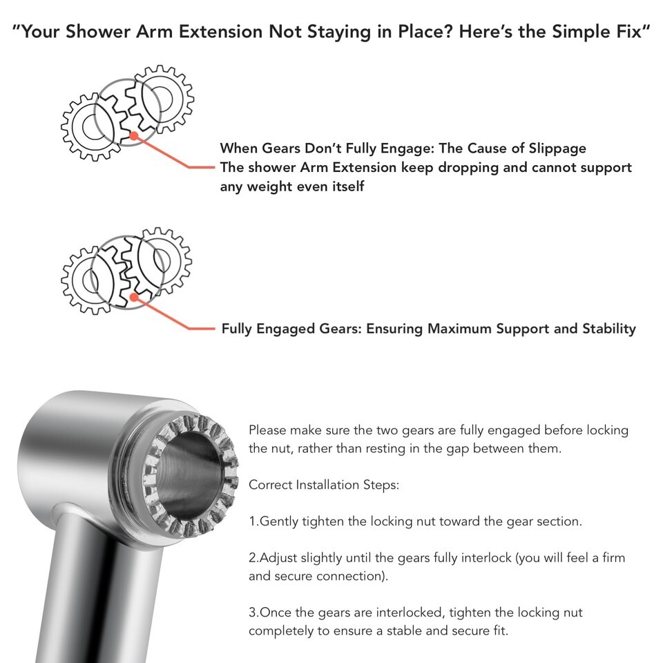 Locking Nut: The nut that will be used to connect with your existing shower arm is equipped with our specially designed locking function. With our included hex key you could easily fix the extension arm and never mind accidentally rotating it.