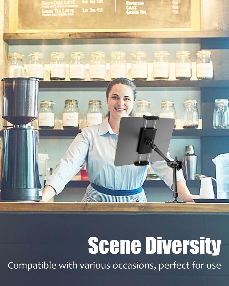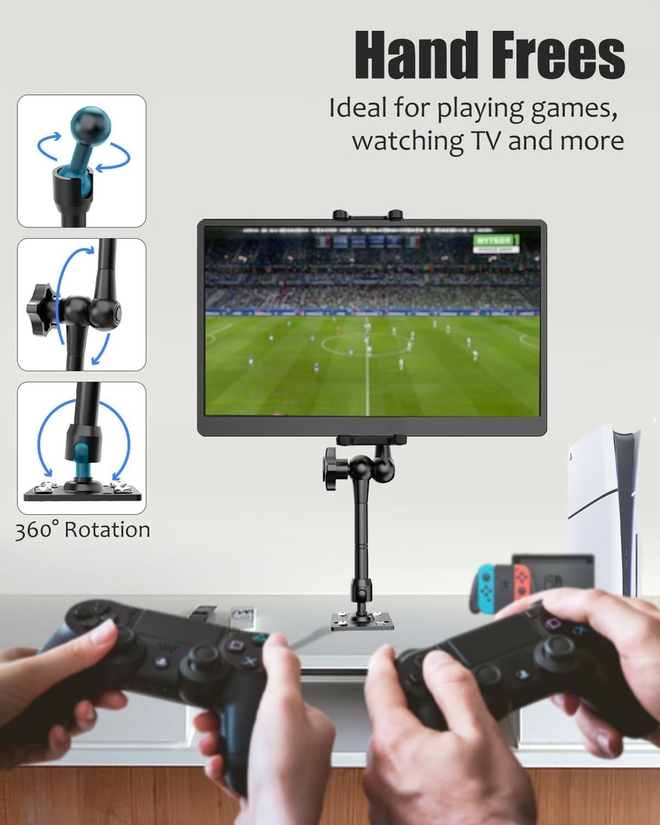 The 10-inch metal folding magic arm tablet holderhas a specially upgraded tightening wheel, which isa tightening knob that locks three joints and a360angle.