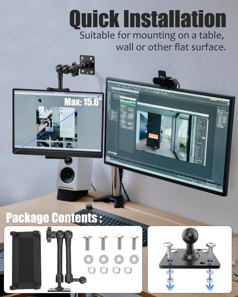 ?Strong and Durable Materials?Single monitor mount arms base are made of metal, and high-quality materials are more durable. The tablet holder is ABS material with non-slip rubber pads to reduce scratches and keep your device stable and not fall off.