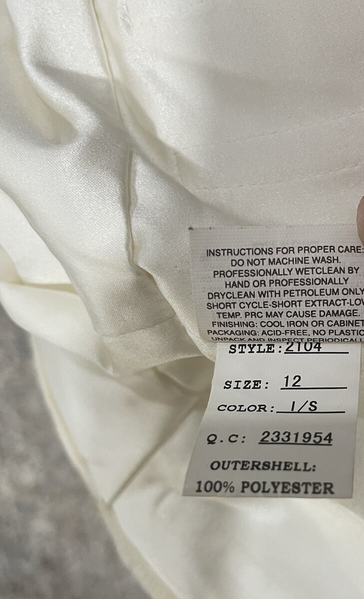 THE DRESS IS NOT IN MINT CONDITION. IT WILL NEED TO BE DRY CLEANED TO REMOVE LIGHT STAINS IT HAS RECEIVED FROM BEING TRIED ON AND BEING HANDLED.