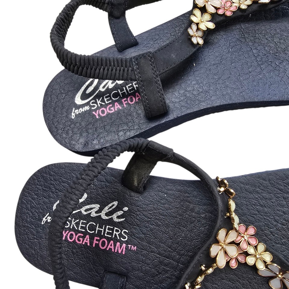 Step into comfort and style with these Skechers Cali women?s sandals. Featuring a sleek black thong design with a delicate floral pattern, these sandals combine casual flair with superior comfort. The blue yoga foam footbed provides lightweight cushioning and support, perfect for all-day wear during summer outings, beach trips, or casual strolls.