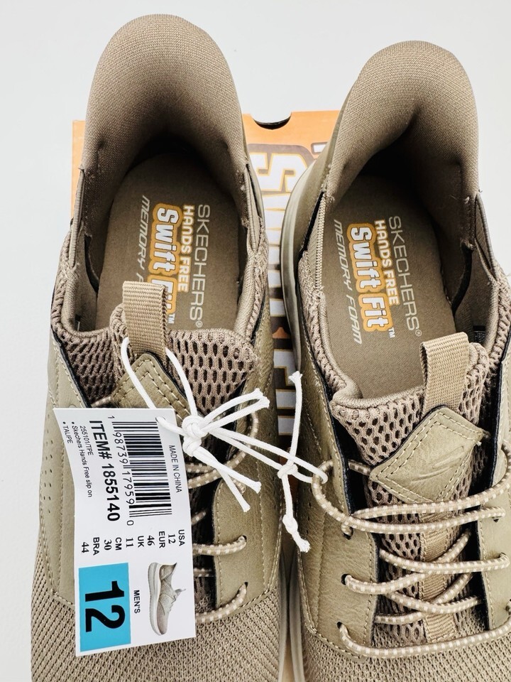 The Skechers Men's Delson Hands Free Swift Fit Tennis Shoe is a stylish and comfortable casual sneaker designed for men. With a beige color and man-made materials upper, this fashion sneaker is perfect for everyday wear. The size 12 shoe is designed for a secure fit and features a convenient hands-free design, making it ideal for on-the-go activities. Whether you're hitting the tennis court or simply running errands, the Skechers Delson shoe offers both style and functionality for the modern man.