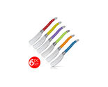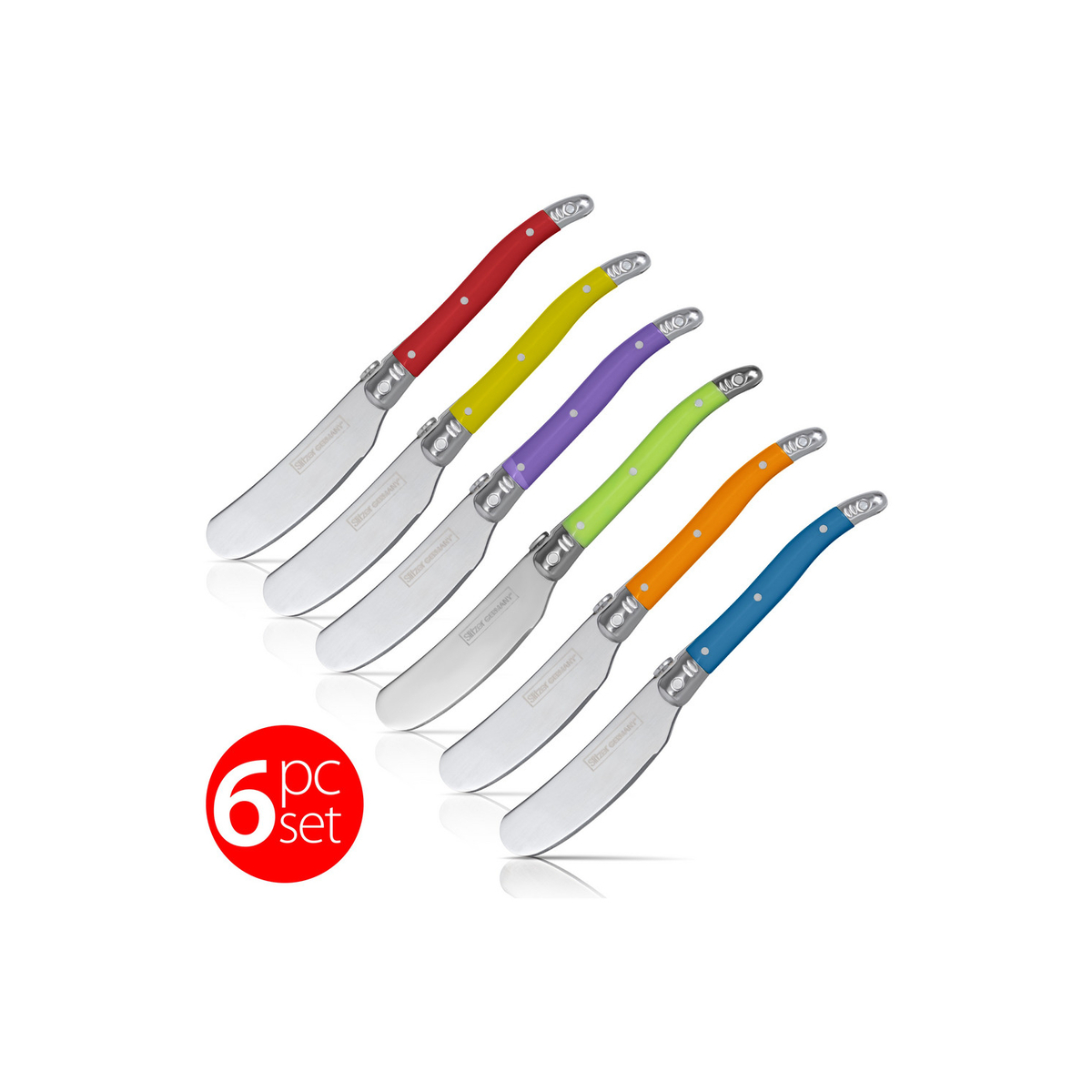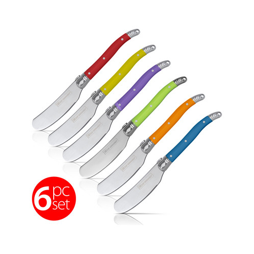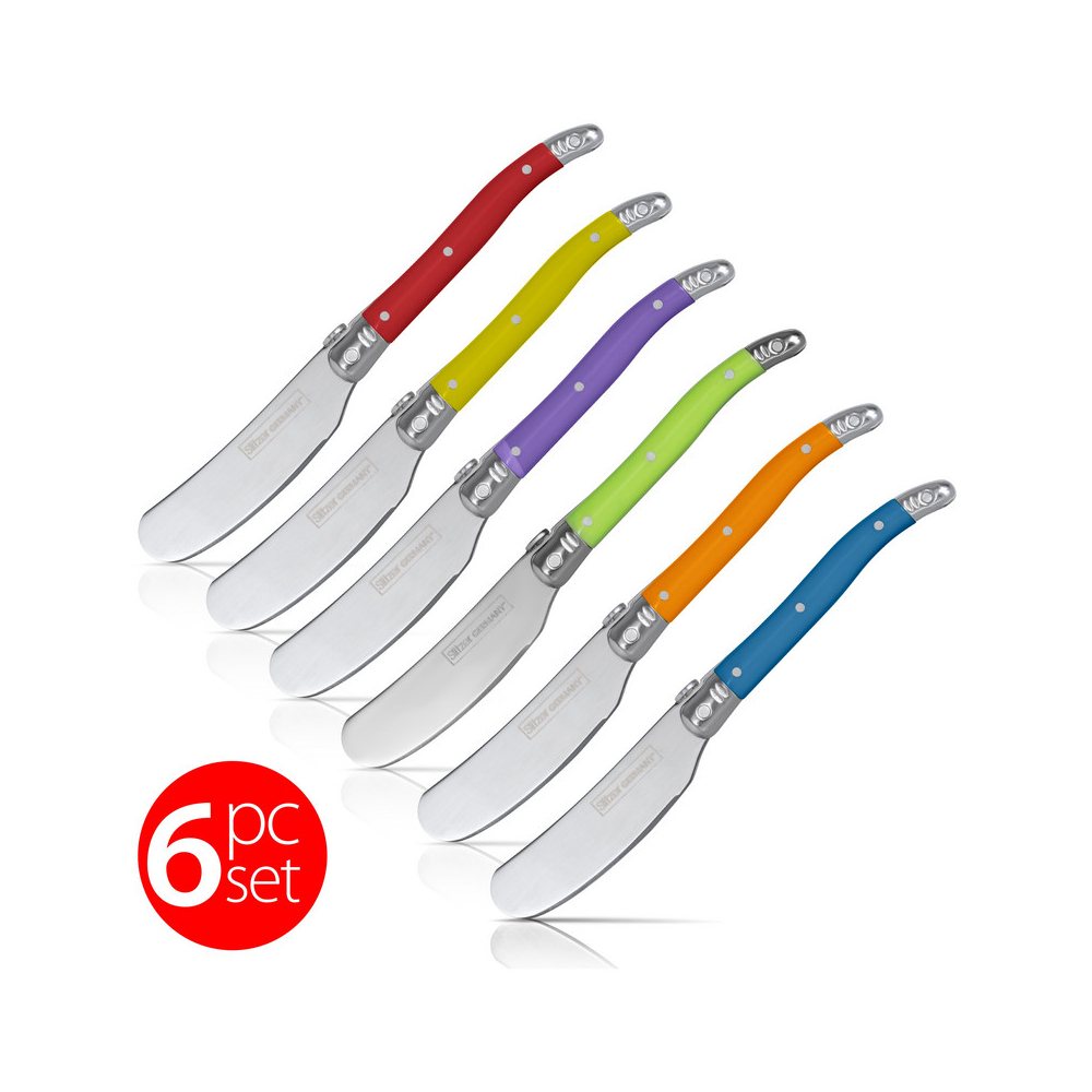 Slitzer Germany 6pc European style Butter Knife Set. Stainless Steel Blade, Colorful ABS Handles with oval thumb rest.