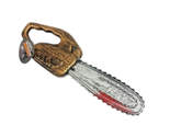 Toy horror movie theme prop weapon measures approx. 16-inch Long x 5-inch Wide. Features soft molded plastic gold body and silver blade saw - chain smeared with faux red blood. Decorate your slaughterhouse, chop shop or meat market, use to Create HAUNTED HOUSE WARNING SIGNS, creepy horror photo booth prop, or accentuate your serial killer costume with this murder themed chainsaw accessory. Cheap, small lightweight prop building accessory.