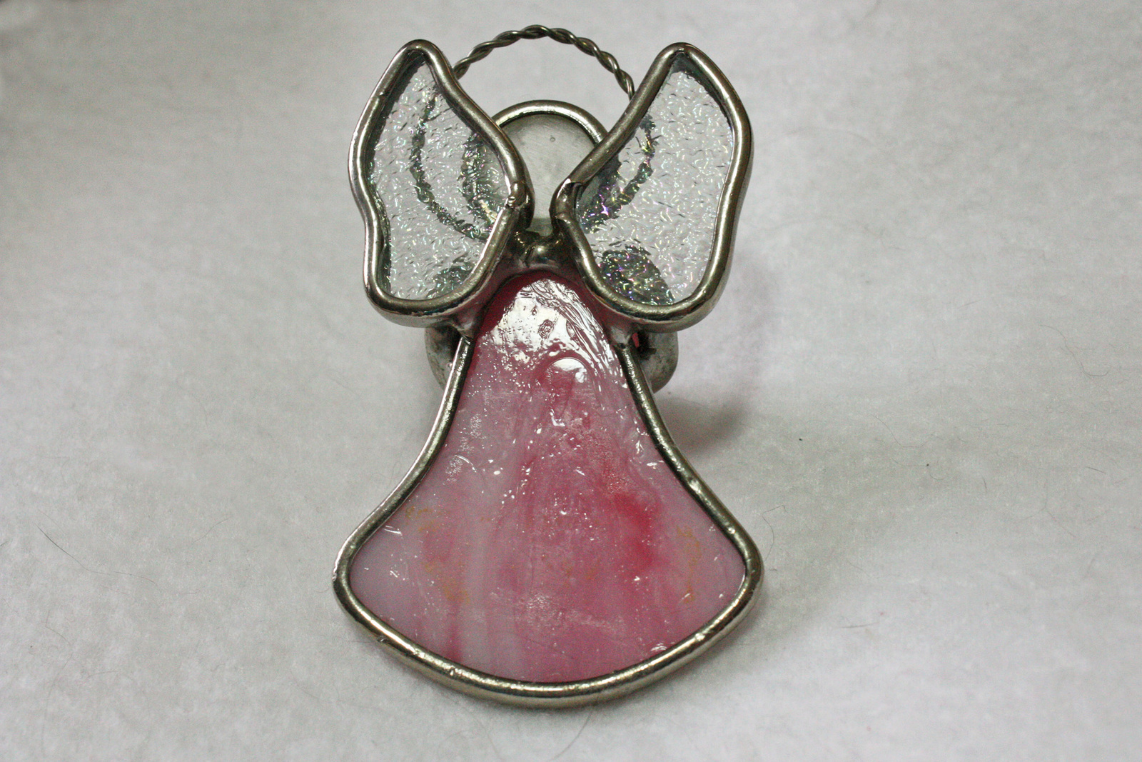 This is a cute small stain glass angel that is in excellent condition. The pink angel is holding a charm that has "I 3 U." The glass has bubbles in it. The ange is 3" high and 1.75" at the widest point.