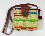 EUC, Excellent Used Condition unbranded small shoulder/cross body straw box bag is perfect for a summer date. Room for you cell, small wallet, keys, and lipstick. Faux leather adjustable strap pretty floral fabric lining. Fun woven multi-color threads accent the front along with 3 multi-color pom poms at the side of one strap. Easy open and close antique brass color buckle flap closure with faux brown leather . There are 4 antique brass color feet on the bottom No rips, tears or stains. Made in China No inside pockets Antique color brass hardware 7x6.5x3 inches Adjustable up to 22 inch strap drop SKU Q027