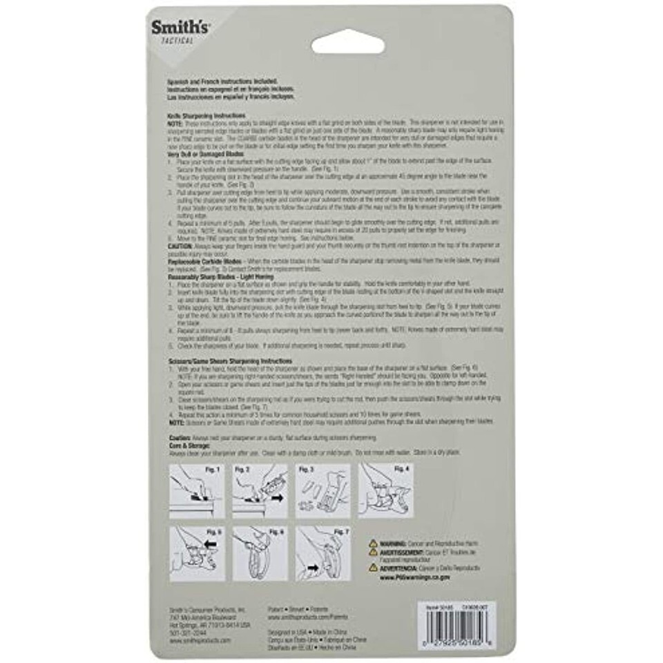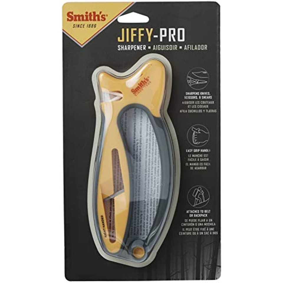 -- Simple and dependable, Smith's Jiffy-Pro handheld sharpener is quick, safe, and easy to use in the field, back at camp, or in your home. Its knife sharpening slots incorporate crossed carbide blades used to set the edge on your blade and crossed ceramic rods used for honing the final edge to razor sharpness. These fixed abrasive components create a preset sharpening angle that guarantees results every time. Sharpens game shears (view larger). Ideal for sharpening skinning/filet knives, the Jiffy-Pro also includes a scissors sharpener integrated into the handle. It uses a patented "floating" carbide rod that adjusts to fit the precise bevel of the blades, and it's been specifically enlarged to accommodate game shears. The crossed carbide blades used in the head of the Jiffy-Pro are precision ground to provide smoother, more consistent metal removal when setting the edge on a very dull or damaged straight edge blade. The extra-fine, crossed ceramic rods on the side of the sharpener are designed to finish and polish the edge to razor sharpness. They are also excellent to use for maintaining an already sharp cutting edge by pulling the blade through the sharpening slot three or four times before each use and as soon as you notice it?s not working as well as it should during use. The Jiffy-Pro has a soft grip, rubber handle for a firm, comfortable grip in all conditions and is made of lightweight, durable plastic. It fits in your pocket or backpack, or can easily be attached to your belt or pack because of the uniquely designed finger guard, which is open on one end.AbrasivesWhat's in the BoxJiffy-Pro 50185 handheld sharpener Product Description Simple And Dependable, The Jiffy-Pro Handheld Sharpener Is Quick, Safe, And Easy To Use In The Field, Back At Camp, Or In Your Home. The Knife Sharpening Slots Incorporate Crossed Carbide Blades Used To Set The Edge On Your Extremely Dull Or Damaged Blade And Crossed Ceramic Rods Used For Honing The Final Edge To Razor Sharpness. These Fixed Abrasive Components Create A Preset Sharpening Angle That Assures Results Every Time No Matter Where You Are Sharpening Your Knife. The Scissors Sharpening Slot In The Handle Of The Jiffy-Pro Has Been Enlarged To Accommodate Game Shears As Well. It Uses A Patented, Floating Carbide Rod That Adjusts To Fit The Precise Bevel Of The Blades And Has A Soft Grip Rubber Handle For A Firm, Comfortable Grip In All Conditions. From the Manufacturer Simple and dependable, the Jiffy-Pro Handheld Sharpener is quick, safe, and easy to use in the field, back at camp, or in your home. The knife sharpening slots incorporate crossed carbide blades used to set the edge on your extremely dull or damaged blade and crossed ceramic rods used for honing the final edge to razor sharpness. These fixed abrasive components create a preset sharpening angle that guarantees results every time no matter where you are sharpening your knife. The scissors sharpening slot in the handle of the Jiffy-Pro has been enlarged to accommodate Game Shears as well. It uses a patented, "FLOATING" carbide rod that adjusts to fit the precise bevel of the blades. The Jiffy-Pro has a soft grip rubber handle for a firm, comfortable grip during use in all conditions.