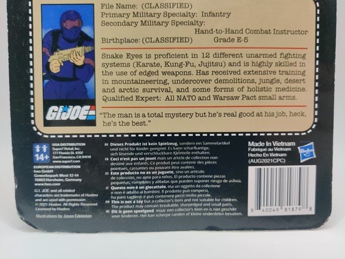 This is a Snake Eyes G.I. Joe Action Figure from Wave 2 by Super7. It is an original item manufactured in 2021 and is part of the ReAction series. The figure stands 3.75" inches tall and features an assault rifle. It is based on the character Snake Eyes from the movie G.I. Joe: Snake Eyes, with a blue color scheme and made of plastic material. The action figure is boxed and adjustable, designed for ages 12-16 years.