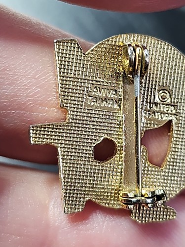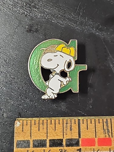 This is a vintage collectible lapel pin featuring Snoopy from the Peanuts franchise. The pin is made of enamelware and features the letter "G" in an alphabet theme. The pin is green and has enameled features. It is an original piece and not signed.