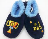 NWT, New With Tags Sales Samples. Men's Snoozies dark navy blue #1 DAD slippers. The perfect gift for your #1 Dad. Embroidered on one slipper is #1 DAD in gold thread with gold stars around it. On the other slipper is an embroidered gold colored chalice with a blue ribbon on it and the number 1. Soft and comfortable.