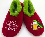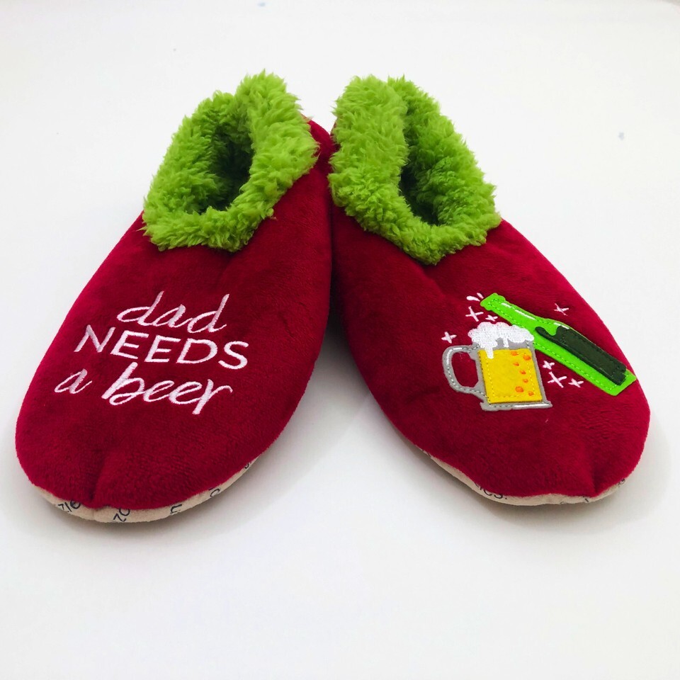 NWT, New With Tags Sales Samples. Men's Snoozies burgundy "Dad Needs A Beer" slippers One slipper has embroidered on it "dad NEEDS a beer" and the other slipper has and applique of a foaming mug of beer and a beer bottle. Perfect for the ,DAD, beer lover in your life. Soft and comfortable.
