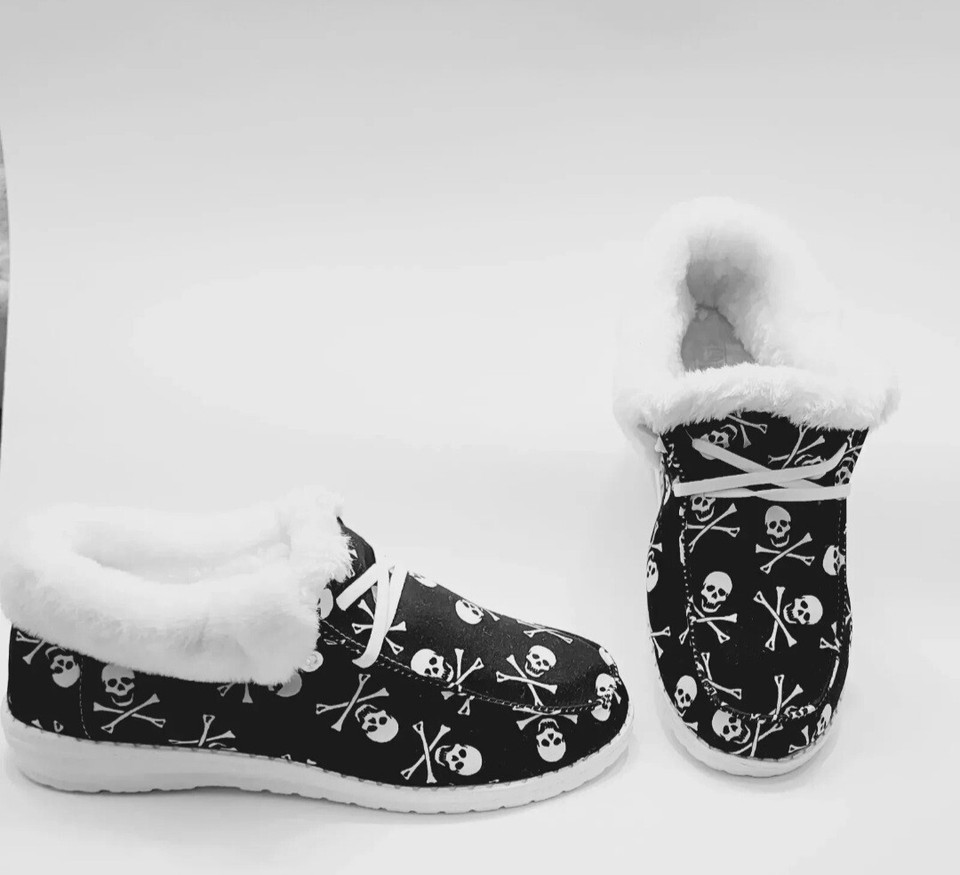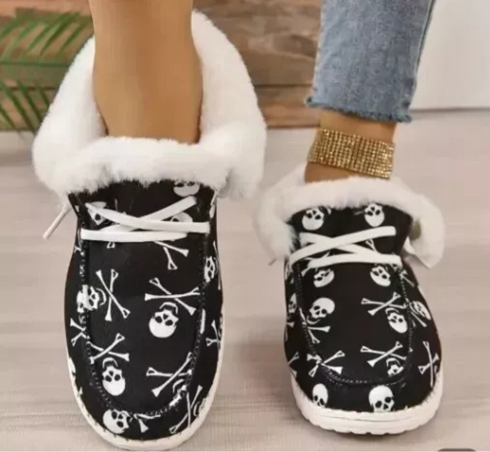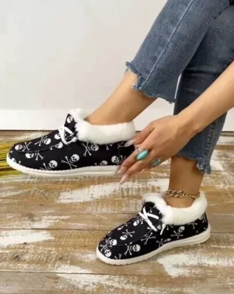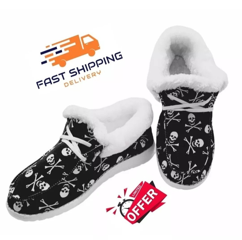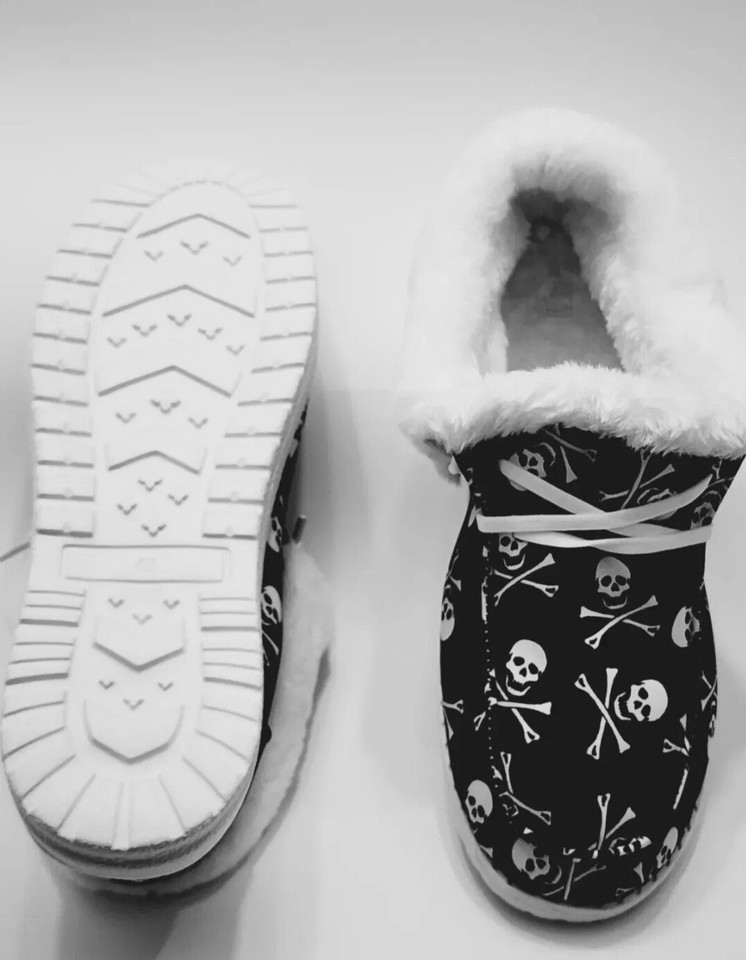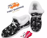 These Snow Shoes are warm ankle boots with lace-up closure for women, perfect for casual and travel occasions during the winter season. The boots feature a round toe shape, flat heel, and are lined, waterproof, lightweight, and comfortable with memory foam and breathable insole. Made of 100% cotton upper material and synthetic insole, these black and white boots are designed for outdoor activities, providing both style and functionality for the cold weather.