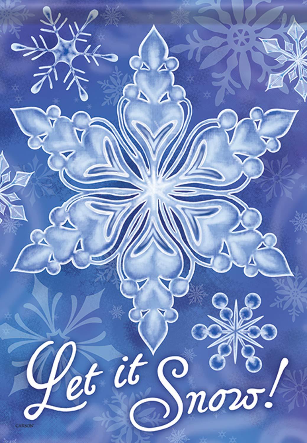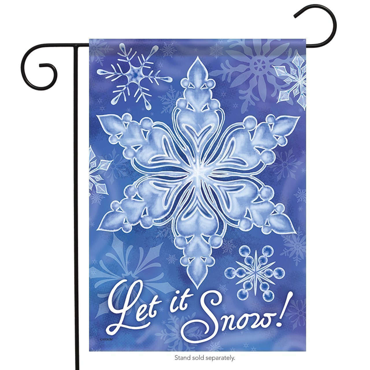 Snowflake Splendor decorative Winter Garden Flag measures 12.5" x 18" by Carson. Decorative garden flag features Winter design shows a large snowflake in the center, with tiny flakes around, with message "Let it snow"! . "Let it Snow reads correctly on both sides. The contrasting colors create a lovely winter flag to welcome friends and family to your home. This stylish Winter Garden Flag will be a great addition to your yard decor. The detailed design will complement any landscape. Pretty background with exceptional detail and vibrant colors. Artwork by Todd Rivers.