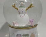Whimsical Snowman Design: A cute snowman with a pink hat, green scarf, and golden twig arms stands inside the globe, surrounded by colorful little presents.