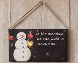 Here is a new smaller hanging led snowman canvas print, has attached burlap hanger and is made of canvas material stretched over a wood frame and has an attached plastic battery box on inside back as you see in 1 pictures and the back is open and requires 2 AA batteries that are not included, it is a nice midnight navy blue color with a white snowman holding a lantern and reads In the meadow we can build a snowman, when turned on the lantern lights up, this measures 7 inch wide by 4 inch high and is 3.4 inch thick, neat small hanger for winter and holiday season.